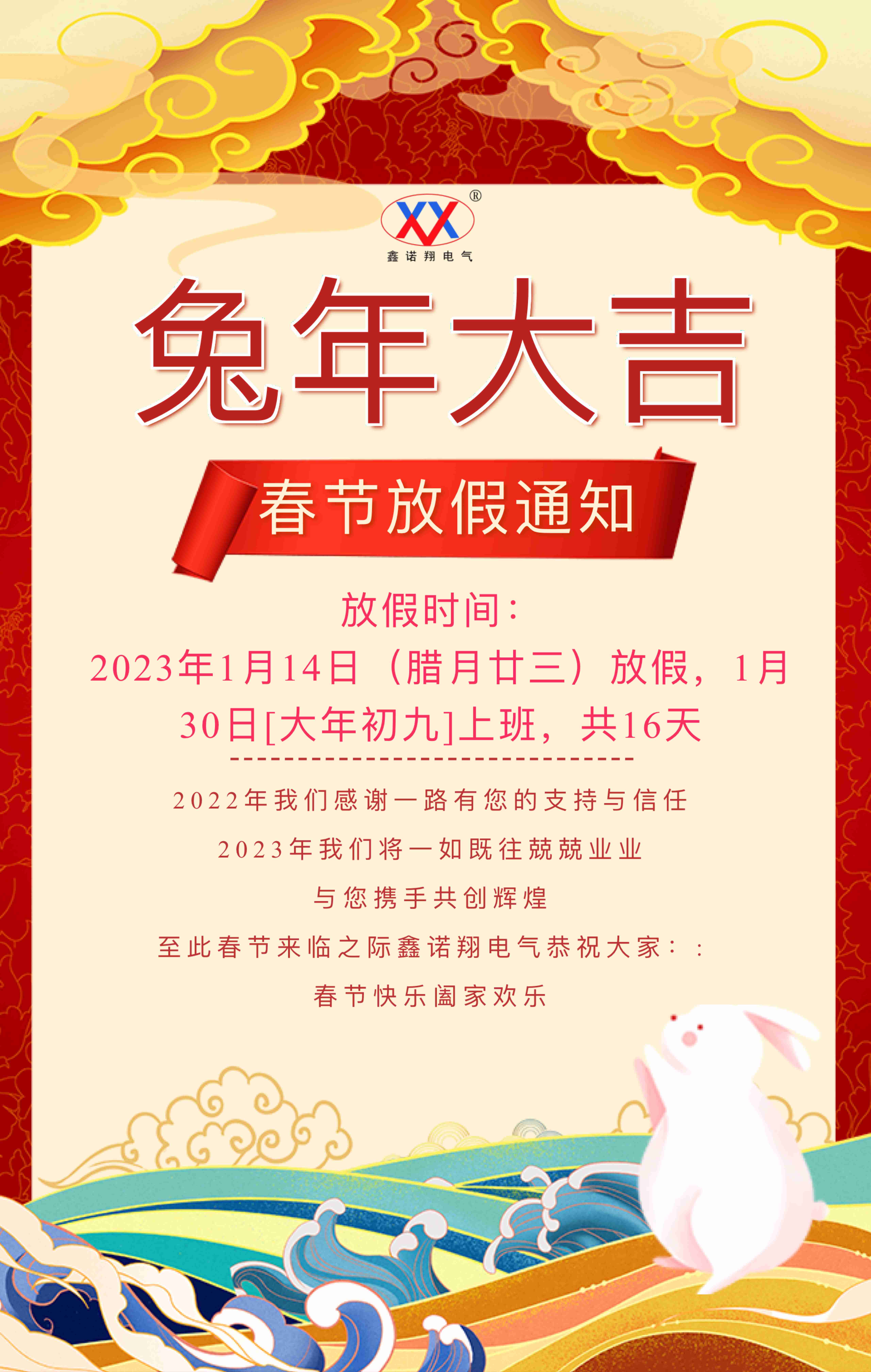 2023年春節(jié)放假通知 各位尊敬的鑫諾翔用戶:大家好! 一年一度的新春佳節(jié)即將來臨,鑫諾翔全體員工向您致以誠摯的祝福和問候,提前祝大家新春愉快! 感謝大家長期以來對(duì)我公司的支持與信任,祝您在即將到來的兔年萬事順意,生意興隆,財(cái)源滾滾! 為了讓公司全體同仁度過一個(gè)歡樂祥和的春節(jié),同時(shí)根據(jù)《國務(wù)院辦公廳關(guān)于2023年部分節(jié)假日安排的通知》中的相關(guān)規(guī)定,結(jié)合我公司實(shí)際情況,我公司2023年春節(jié)放假安排通知如下: 我公司春節(jié)放假時(shí)間為:2023年1月14日(臘月二十三)放假,1月30日(正月初九)上班,共計(jì)16天。 春節(jié)假期內(nèi)我公司不再提供詢價(jià)、報(bào)價(jià)及其他技術(shù)支持服務(wù),不便之處,敬請(qǐng)大家諒解。在春節(jié)休假期間,如有緊急事務(wù),請(qǐng)聯(lián)系王經(jīng)理 13722279995,謝謝!